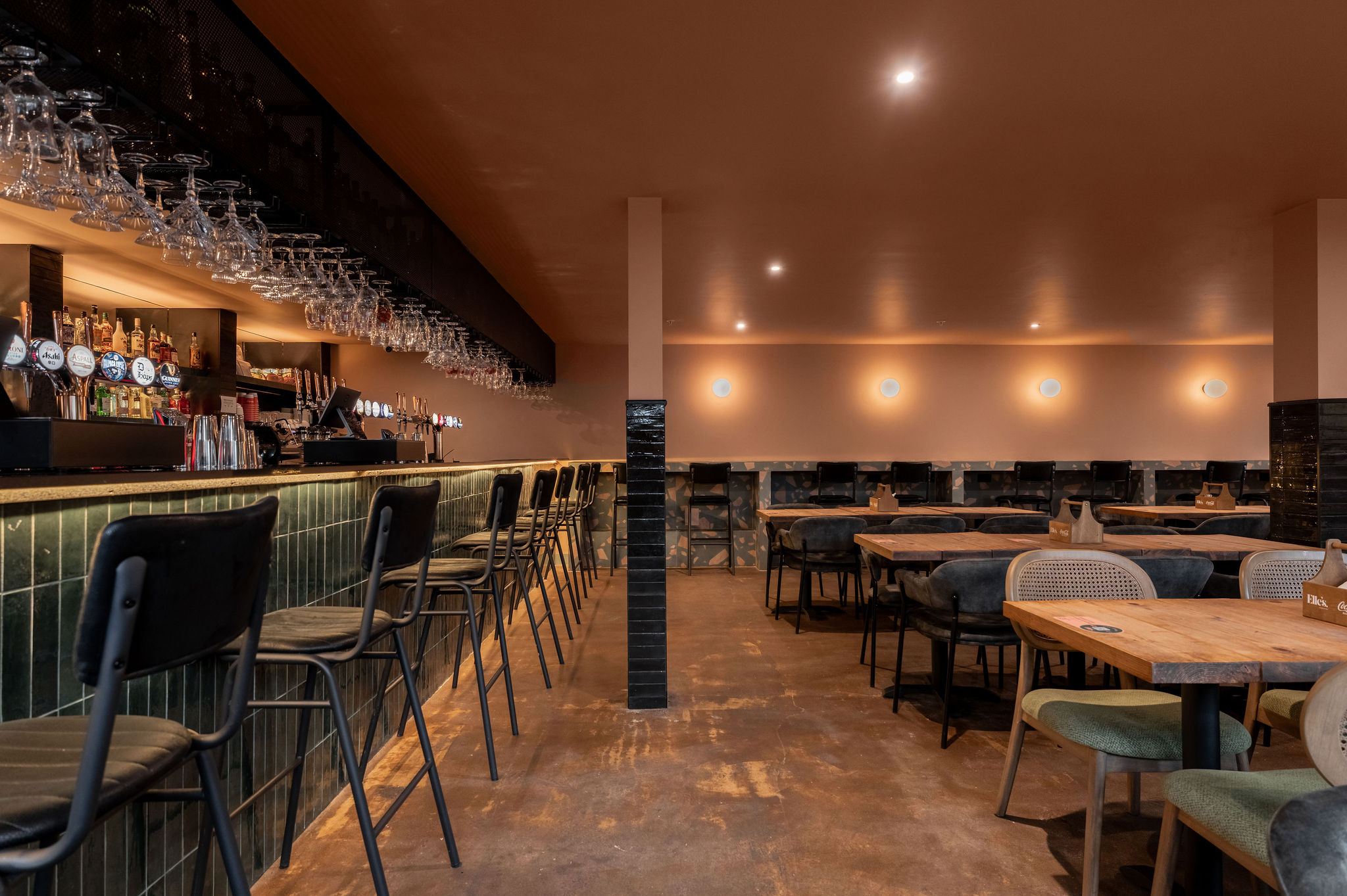 Black Ivy Design has a strong relationship with the Dhillon’s Brewery group, so were the natural choice for this new venture. Elle’s marks a departure from the existing offering and provides something new and exciting for the people of Coventry. The goal was to set a new standard for social dining and the food hall experience, showing that it could be a cosy and community-minded affair.