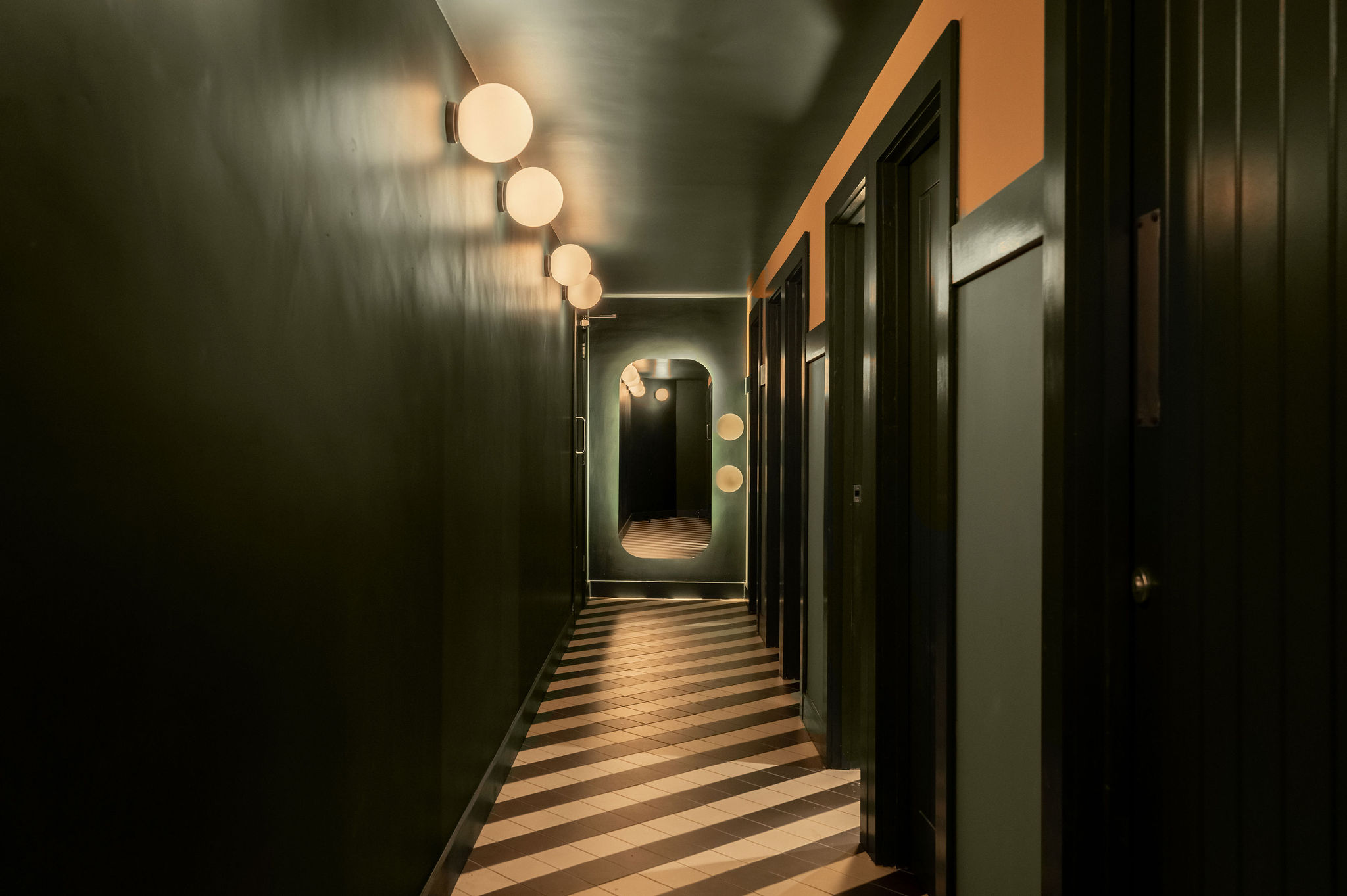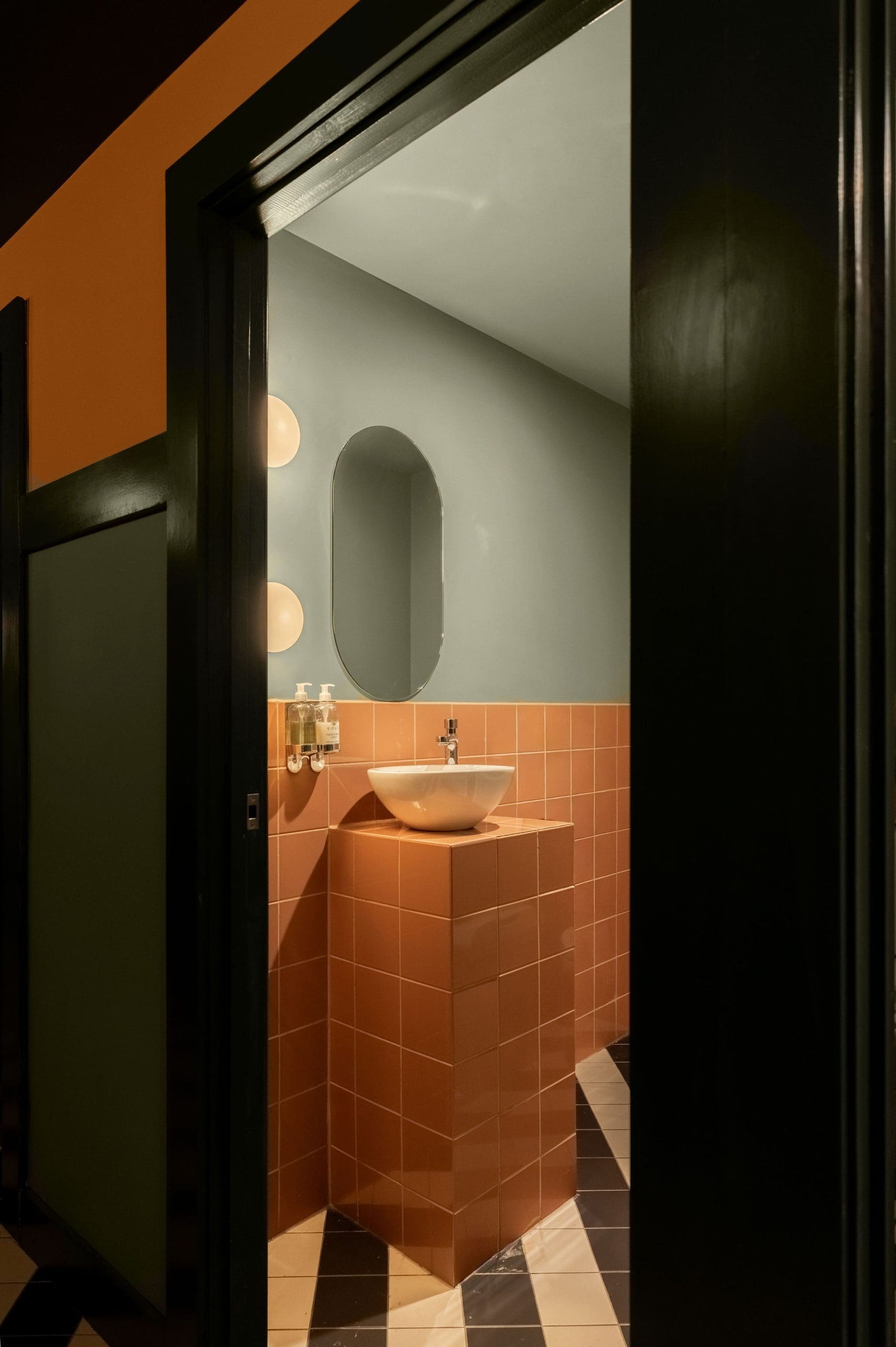Bathed in shades of light green and with accents of soft peach, Elle’s brings a warm minimalist vibe that subverts the expectations of the British food hall. We chose simple opal globe wall lights and over sized pendants, which emphasised the minimalist look and paired this with modern oversized terrazzo tiles in size and print.